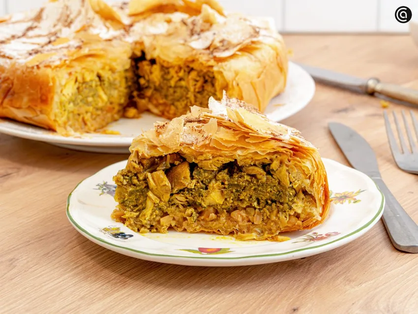 Se trata de un pastel que combina sabores dulces y salados dentro de una envoltura crujiente de pasta filo. El relleno es una mezcla de pollo especiado, cebolla, huevo y almendras, y da lugar a un interior jugoso y aromático que contrasta con el exterior dorado.