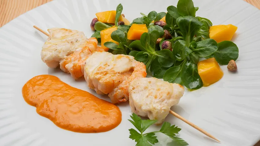 Brocheta de rape y langostinos con ensalada de canónigos y mango