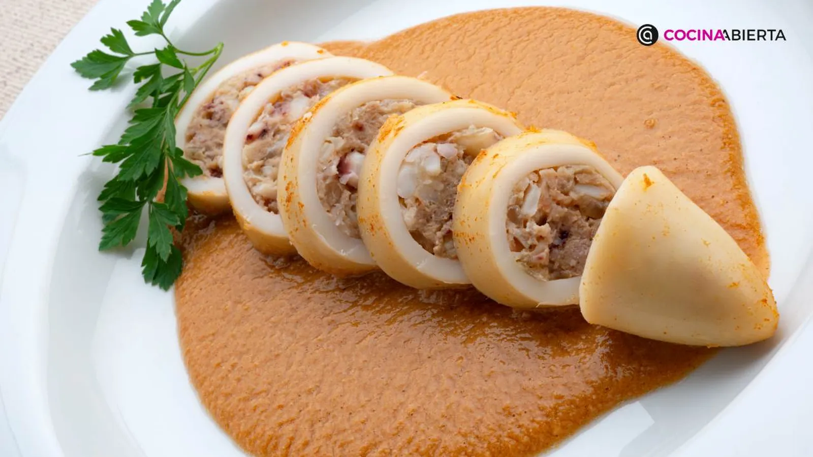 El calamar estará en su punto cuando la carne esté tierna al pincharla con un tenedor. En esta receta, el tiempo de cocción es de 35-40 minutos debido al relleno. Si se excede el tiempo, los calamares pueden volverse gomosos.