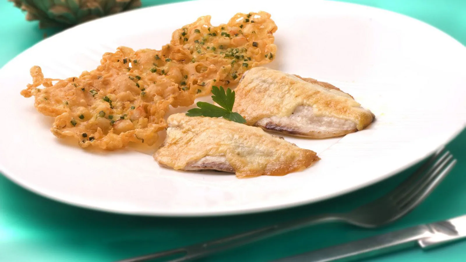 Sirve un chicharro en cada plato y acompaña con tres tortillitas de gambas y cebollino. Decora el plato con una hojita de perejil.