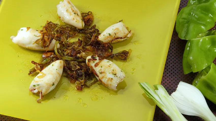 Chipirones rellenos a la plancha con cebolla y pimiento