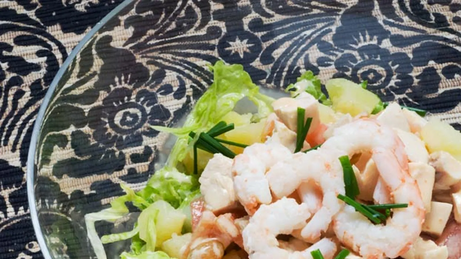Receta de cóctel de pollo y gambas, un plato sabroso y fresco a base de patatas, tomate, pollo y gambas, acompañado de su salsa rosa. Receta de Karlos Arguiñano.