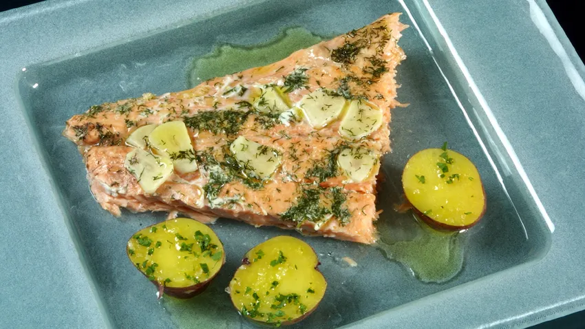 Receta de filetes de salmón asados al horno, especiado con eneldo. Para acompañar unas patatas cocidas.