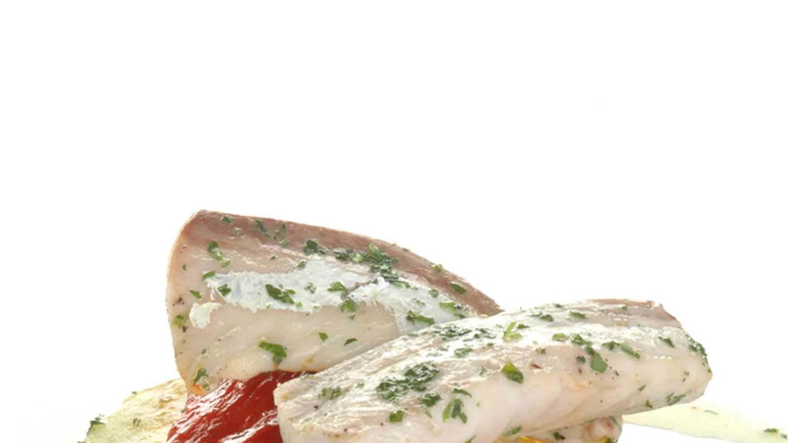 Coloca en una fuente la guarnición (los pimientos, las setas y las patatas cortadas en rodajas) y encima los bastones de caballa. Espolvorea perejil picado.