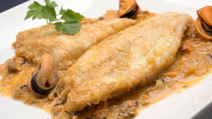 Receta de Karlos Arguiñano de filetes de rodaballo rebozados acompañados de salsa de mejillones.