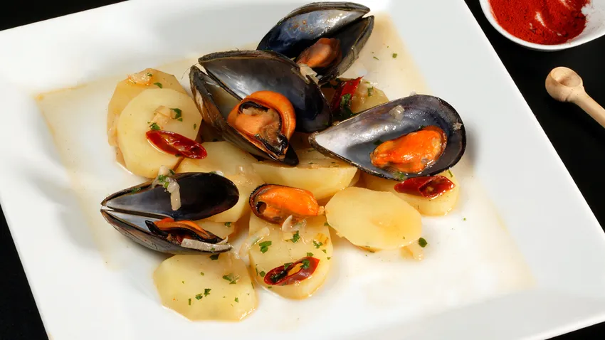Receta de patatas guisadas con guindilla y laurel con mejillones y pimentón.