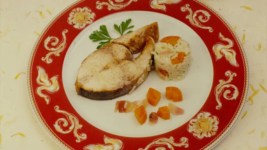 Receta de pez limón asado al horno con arroz blanco cocido y panceta. Receta de Karlos Arguiñano en Argentina.