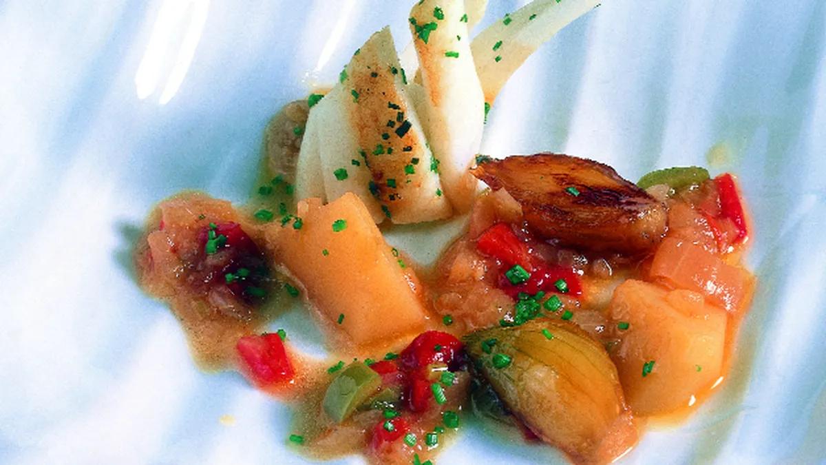 Dispón en un plato hondo unas cucharadas del marmitako, procurando que se vean bien los chipirones. Alterna éstos con las chalotas glaseadas.