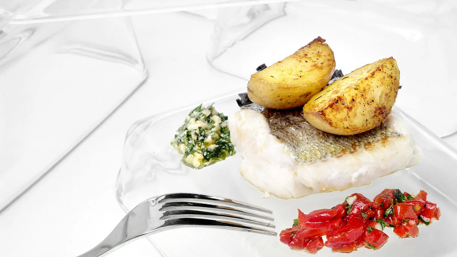 Sirve la merluza con las patatas. Acompaña con una línea gruesa de cada una de las salsas.