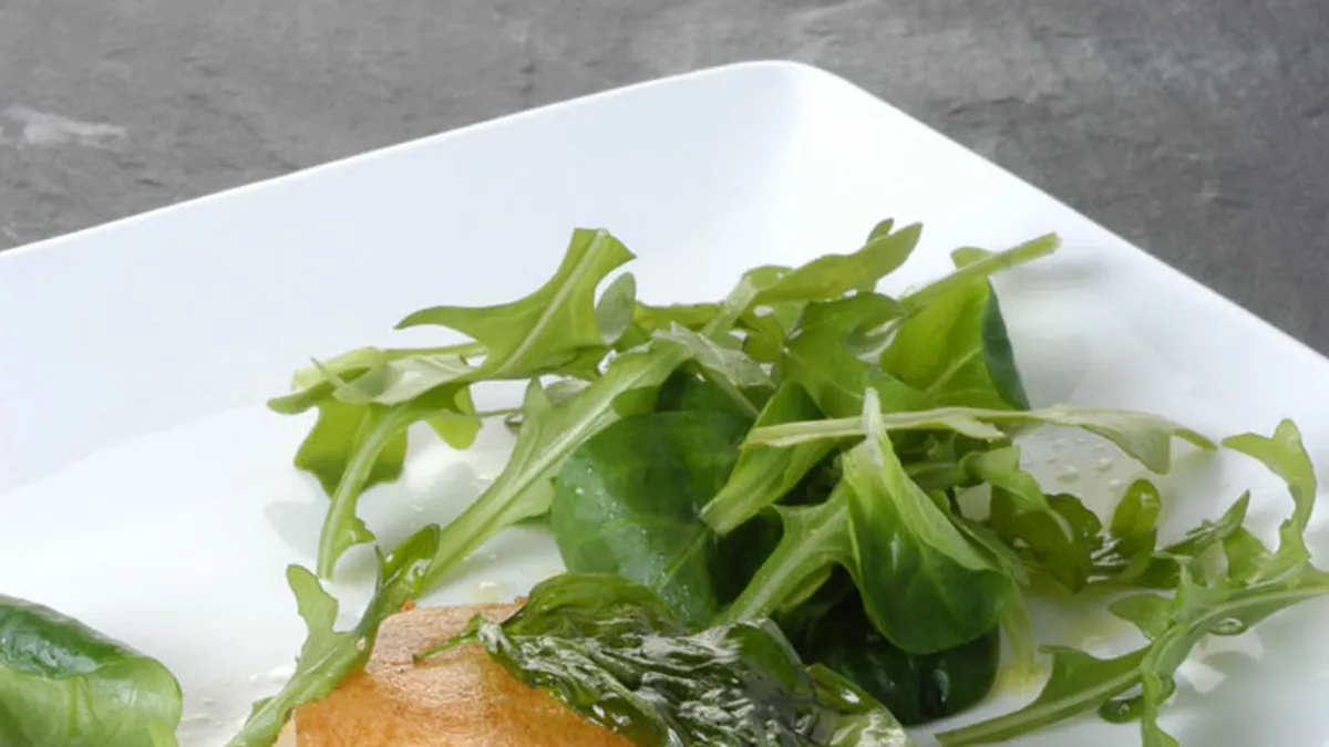 Receta de filetes de perca asados al horno y acompañados de patatas, una ensalada de canónigos y rúcula y una mayonesa de ajo.