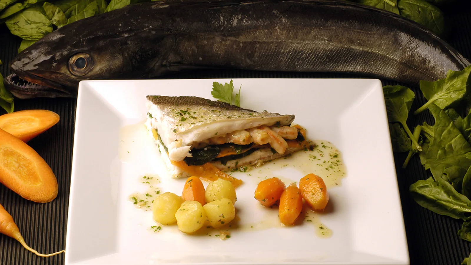 Pescadilla rellena de espinacas y gambas