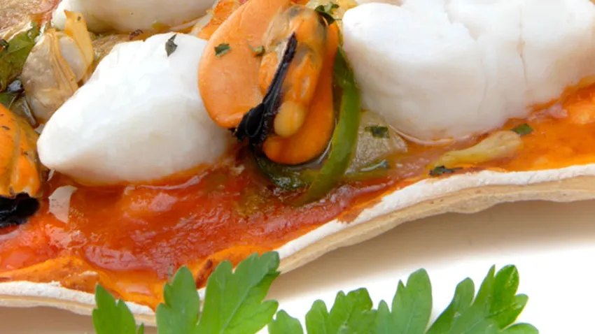 Trocea la pescadilla en dados, sazona y colócalos en la pizza. Añade las almejas y los mejillones, rocía con albahaca y hornea a 180º durante 8 minutos. Retira a una fuente y adorna con perejil.