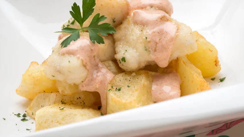 Receta de Karlos Arguiñano de rape empanado acompañado de patatas con salsa brava de yogur.
