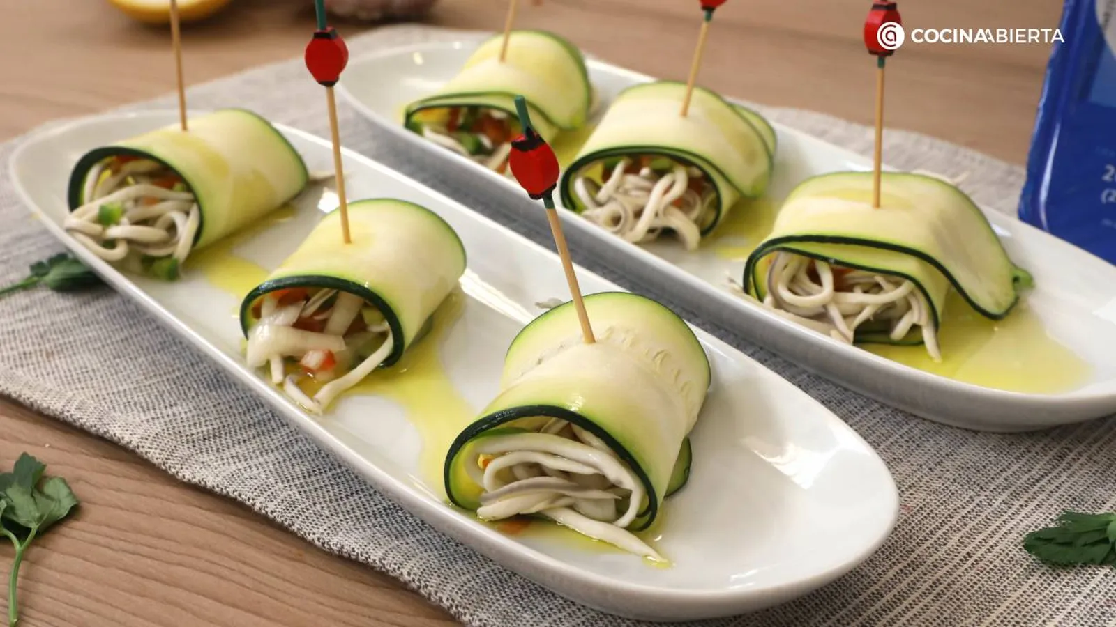 Sirve este aperitivo de rollitos de calabacín rellenos de gulas, pimiento y cebolleta.