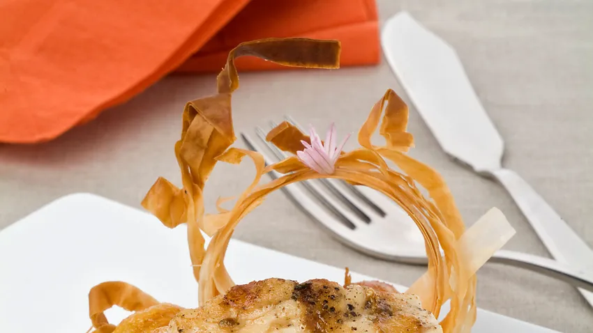Parte en dos el rape, Salpimienta y ásalo a la plancha con un chorrito de aceite. Sirve el salteado de verduras, coloca encima el rape y adereza con la salsa de huevo. Adorna el rape por encima con los cilindros de pasta philo y unas flores de cebollino.