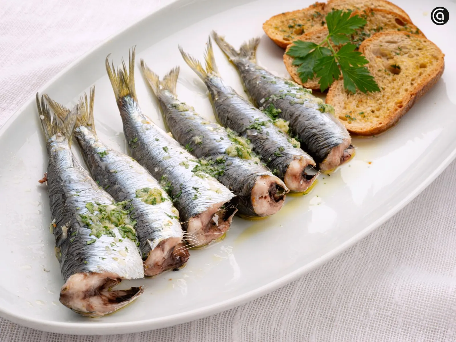 Sirve las sardinas al horno acompañadas con pan de ajo