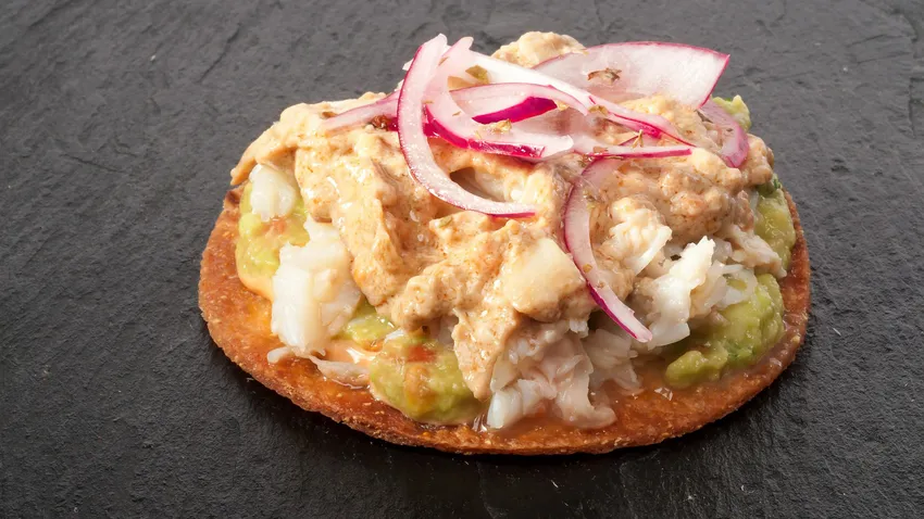 Unta las tortillas de maíz fritas con un poco de mahonesa de chipotle. Extiende encima un poco de guacamole, la carne de buey de mar, el coral y por último la cebolla crujiente.