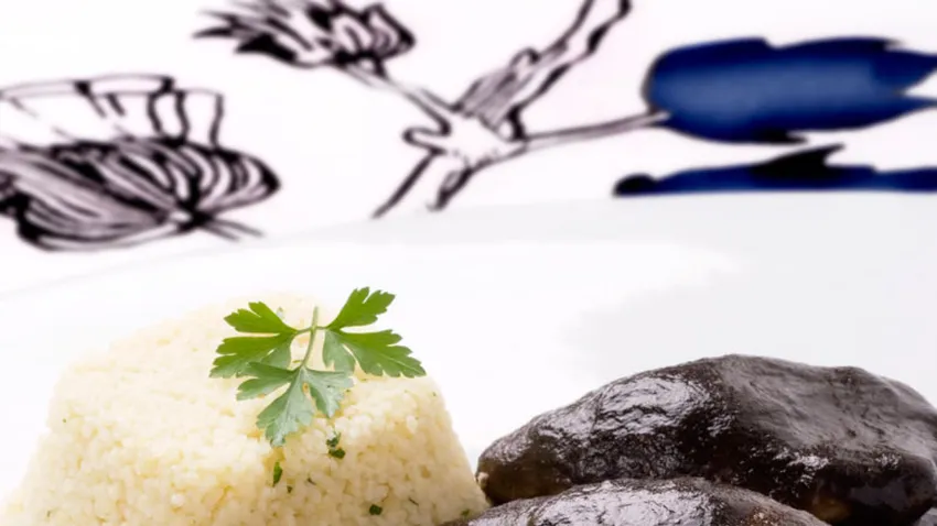 Coloca el cous-cous en un cuenco y añade la misma cantidad de caldo caliente que de cous-cous. Agrega perejil picado, coloca un plástico transparente y deja que se hidrate bien. Introduce el cous-cous en un molde y desmóldalo sobre un plato. Sirve los txipirones, salsea y decora con una hojita de perejil.