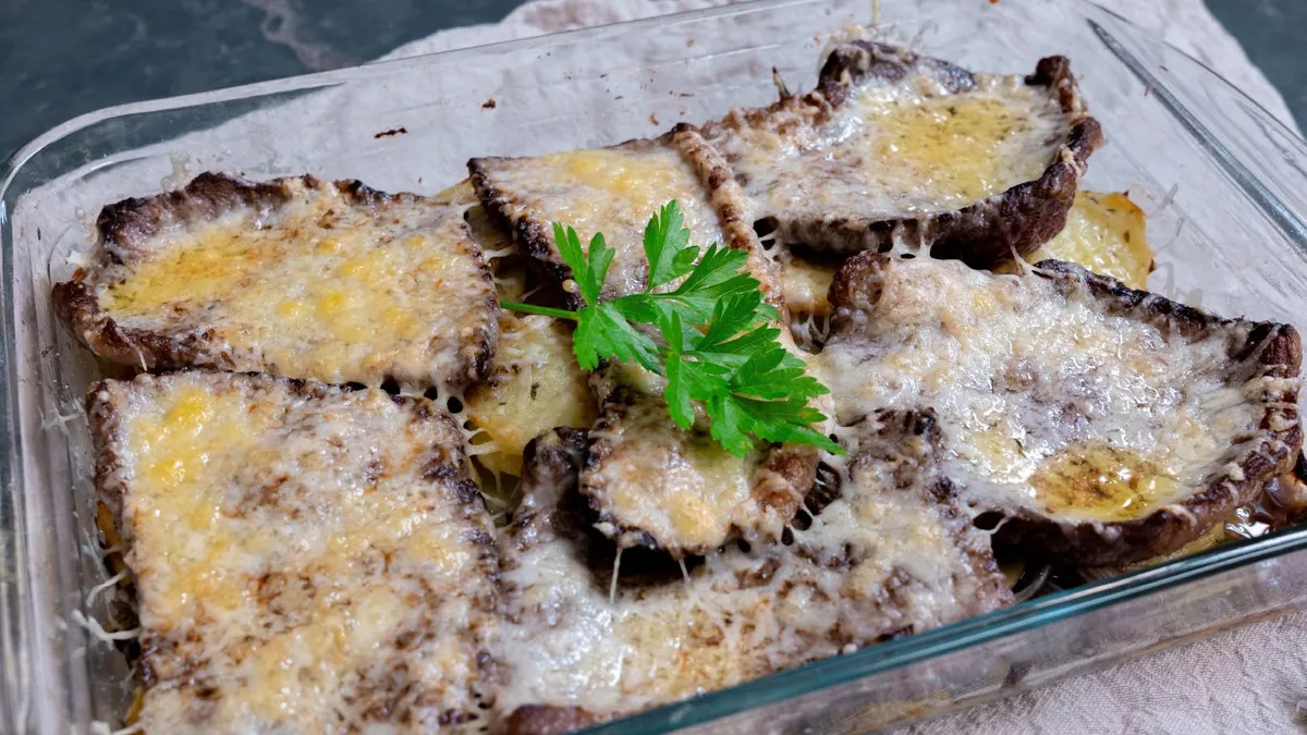 Una vez que el queso se ha fundido, saca la fuente del horno y sirve la picaña de ternera. Decora con una hoja de perejil.