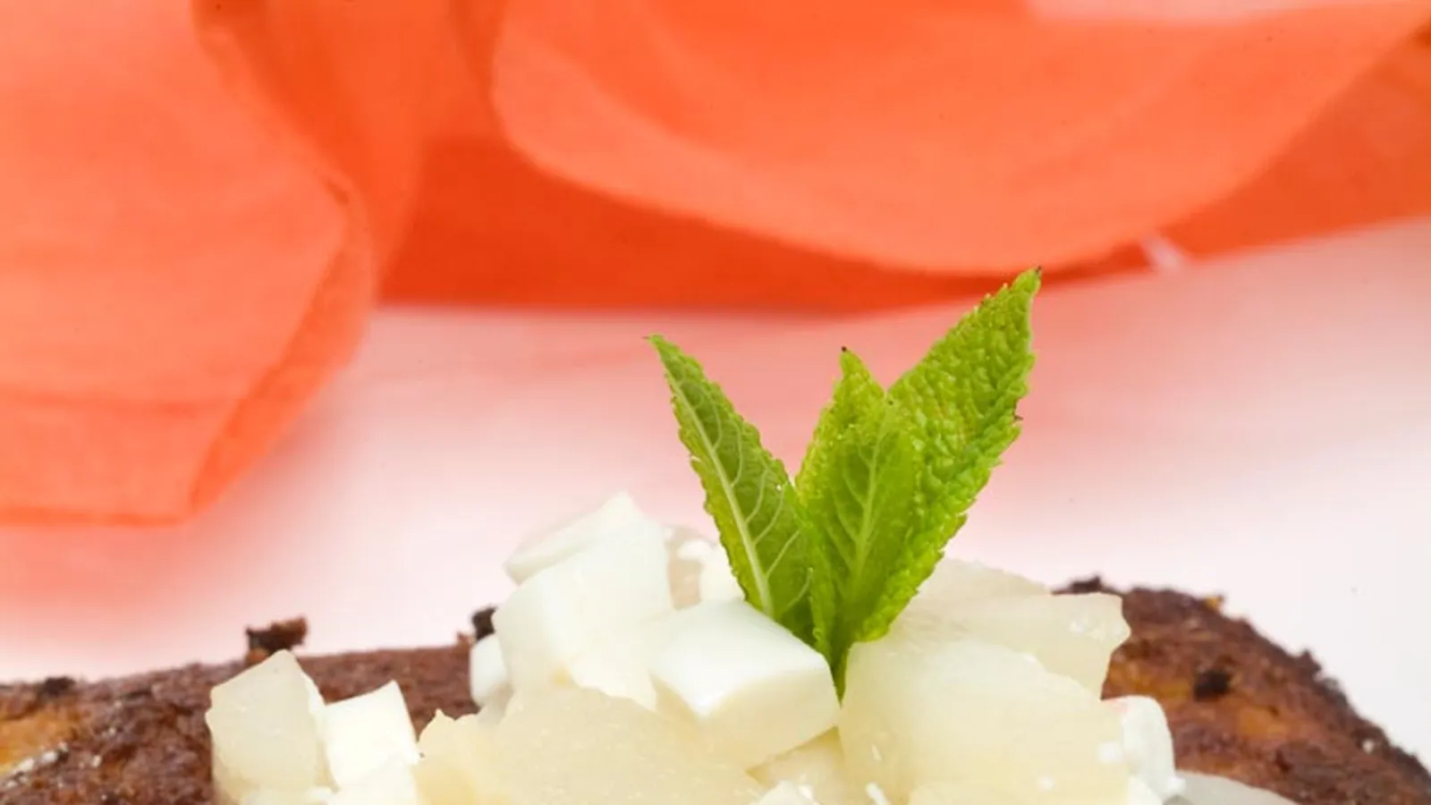 Para emplatar, coloca cada bizcochito en un plato. Reparte por encima la compota de pera y decora con unas hojas de menta.