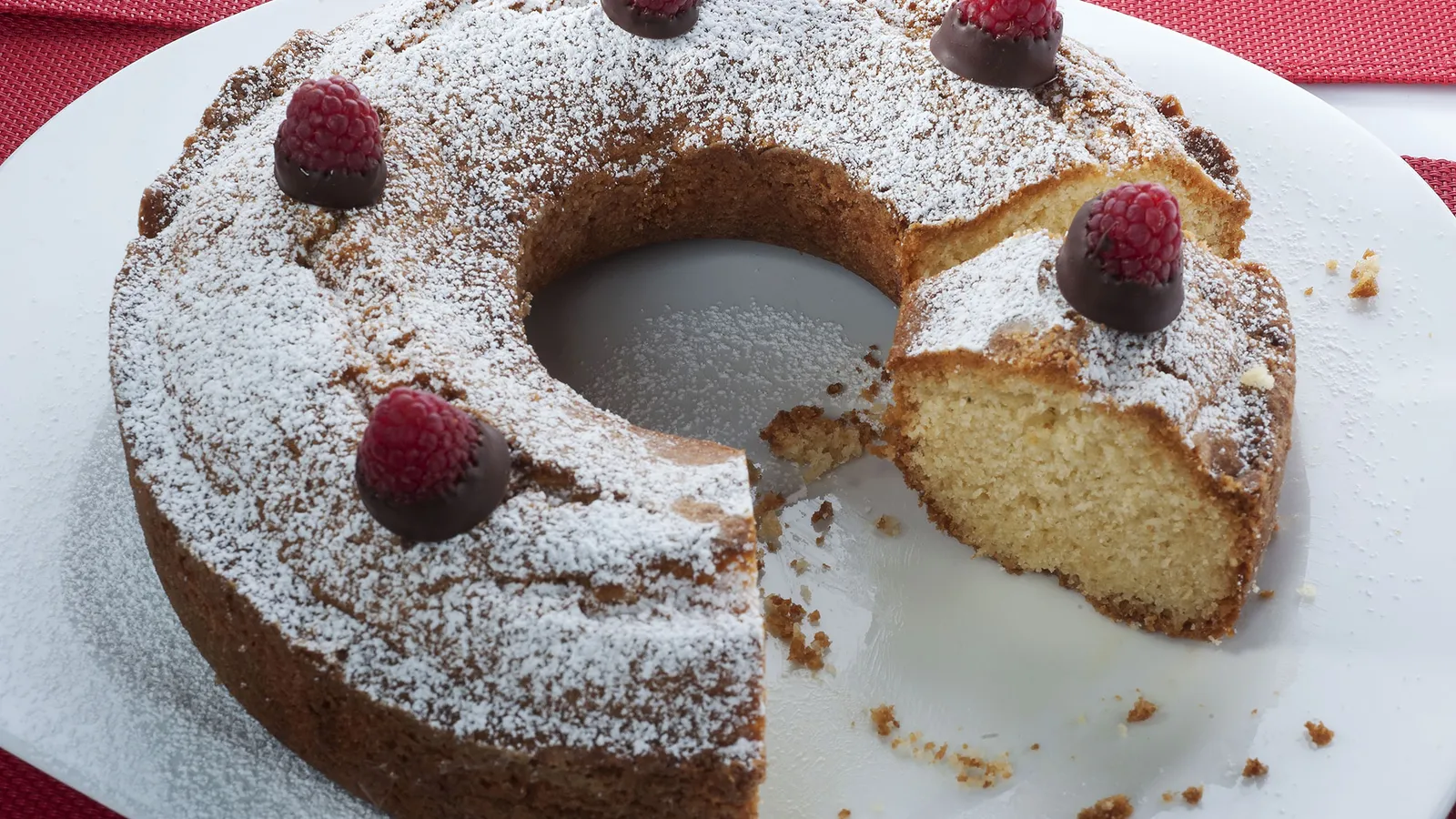 Deja enfriar y desmolda el bizcocho. Decora con el azúcar glas y las frambuesas de chocolate.