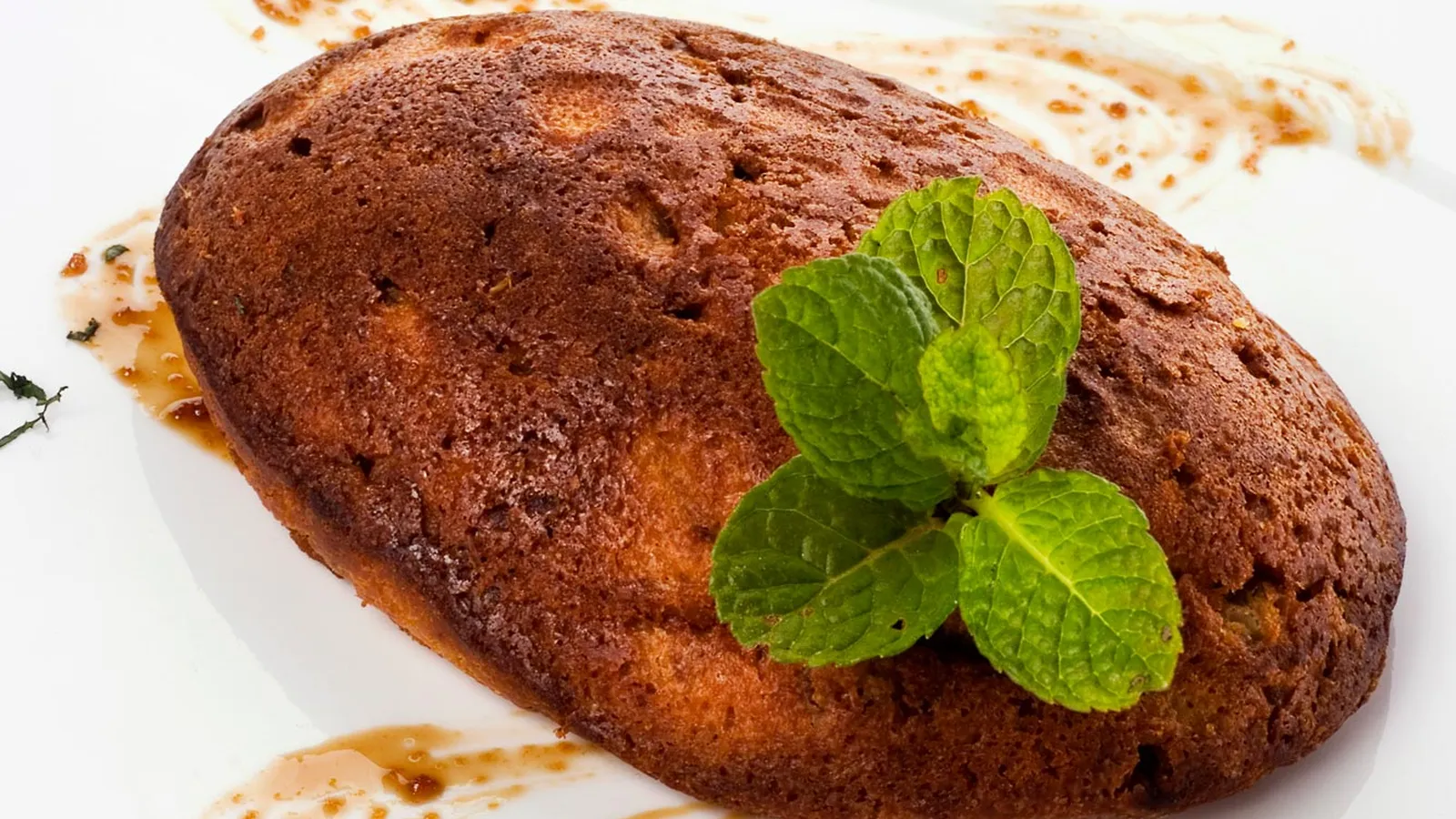 Para emplatar, decora el plato con la salsa de vino, coloca encima los bizcochos y decora con menta.