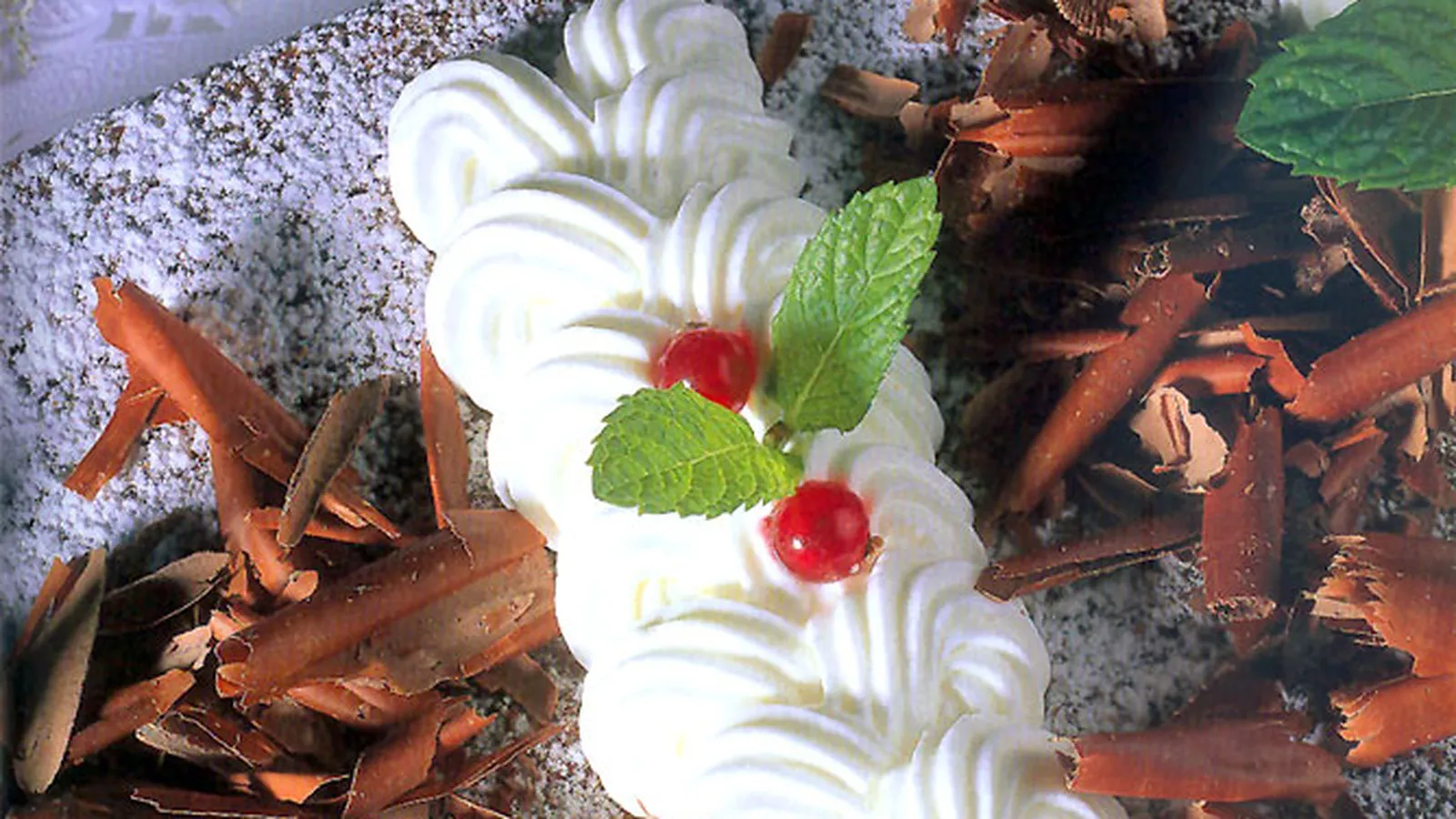 Desmolda en frío. Decora con nata montada, azúcar glas, unas frambuesas, viruta de chocolate y unas hojas de menta.