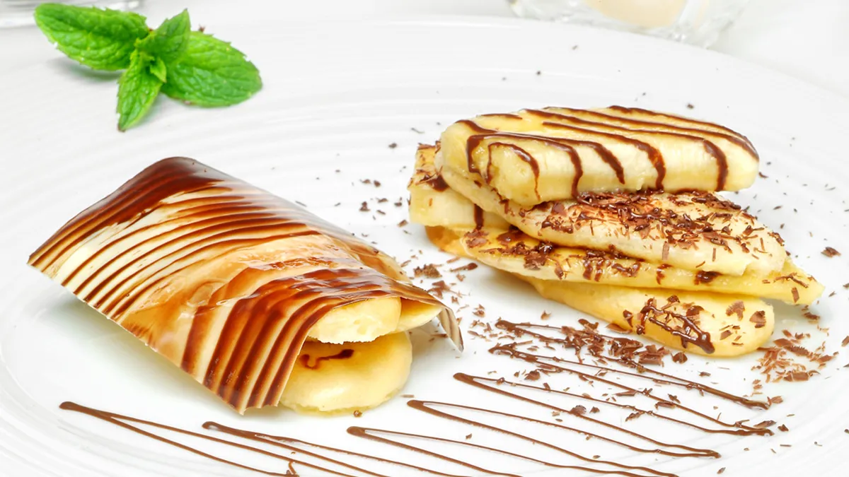 Prepara el plato poniendo entre dos bizcochos, el plátano macerado y unos hilos de chocolate fundido. Puedes rellenar también con un poco de azúcar moreno. Para decorar el plato puedes hacerlo de varias maneras, ralla un poco de cobertura de chocolate sobre los bizcochos rellenos o cúbrelos con una lámina fina de chocolate.