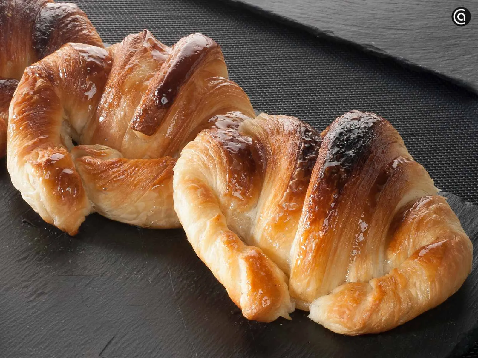 Saca los croissants del horno y úntalos con el jarabe. Sirve.