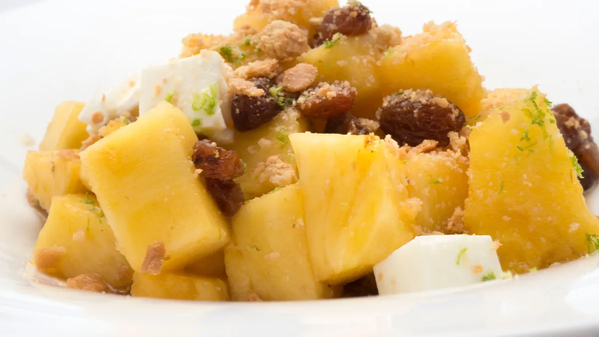 Receta de compota de frutas con piña, uvas pasas, queso fresco y un toque de azúcar moreno y cardamomo.