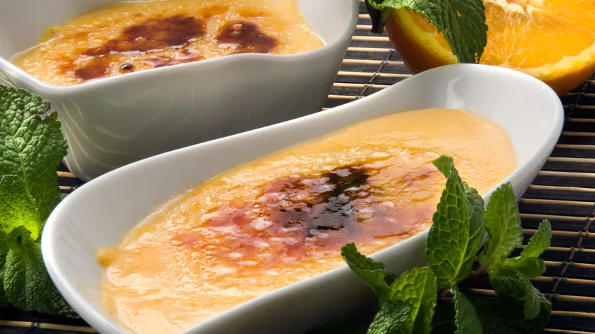 Reparte la mezcla en 4 recipientes y deja atemperar. Coloca en el centro de cada uno un poco de azúcar y quema la superficie con un soplete. Coloca encima unos gajos de mandarina y decora con una ramita de menta.