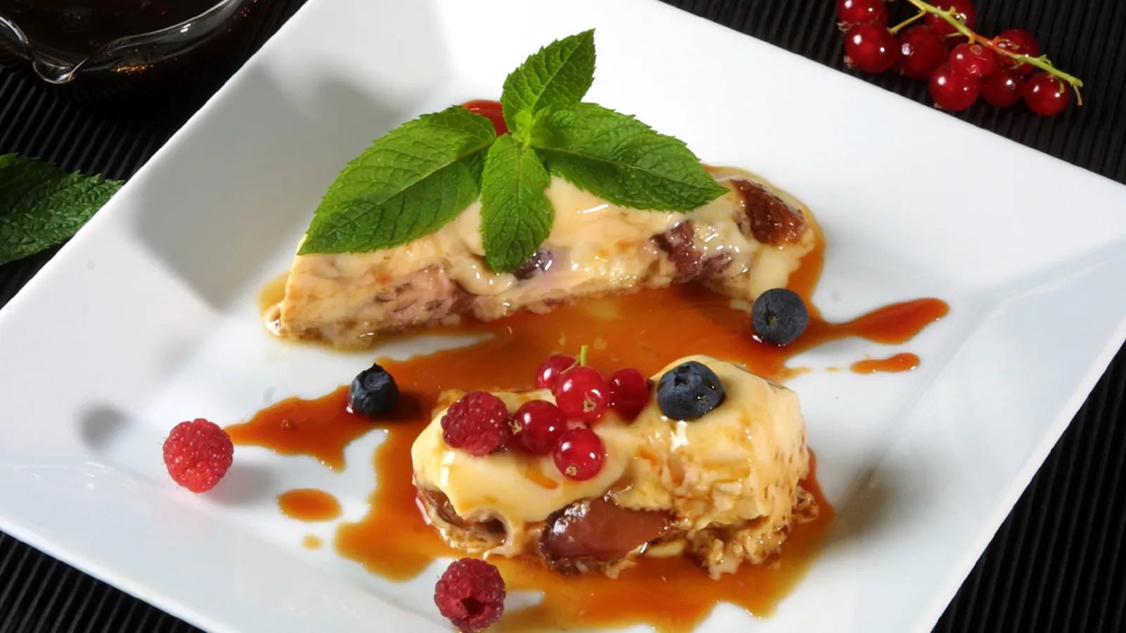 Receta de flan de huevo y leche con frutas rojas: fresas, cerezas y frambuesas.