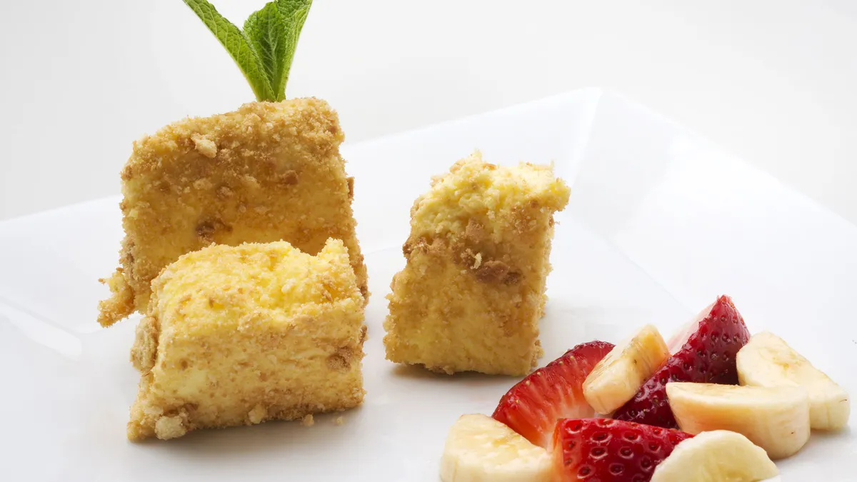 Pasa la mezcla a una flanera rectangular y cuécelo en el horno al baño María a 130ºC durante 1 hora. Deja que el flan se enfríe, córtalo en tacos (retirándoles la base) y rebózalos con la galleta.