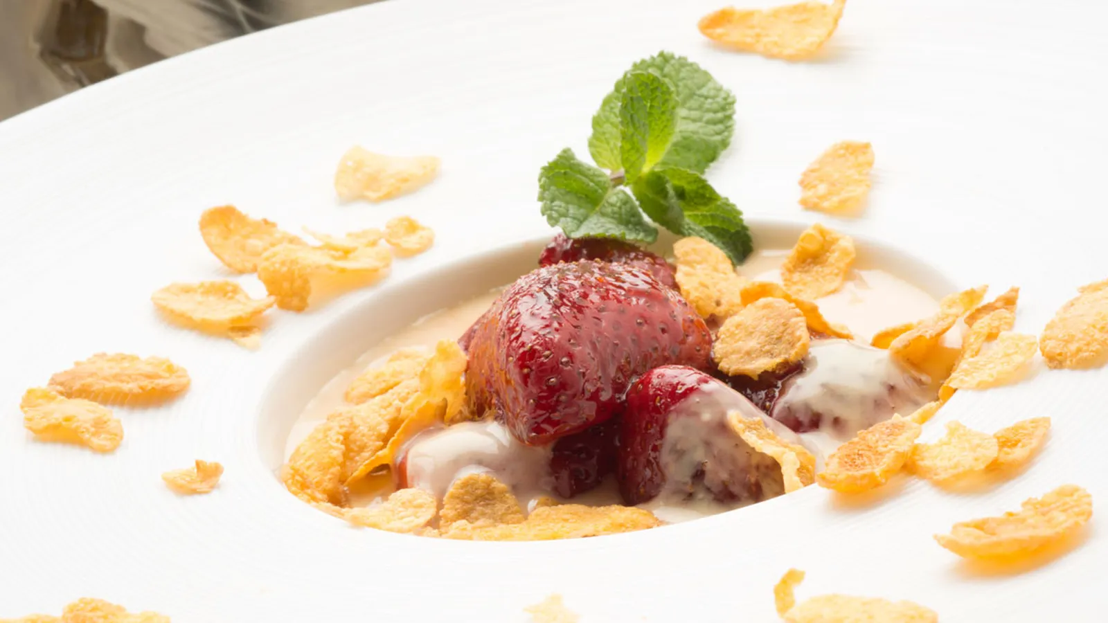 Coloca los yogures en un bol y bátelos un poco. Sirve en el fondo el yogur y coloca encima las fresas. Espolvorea con los copos tostados de maíz y adorna con unas hojas de menta.