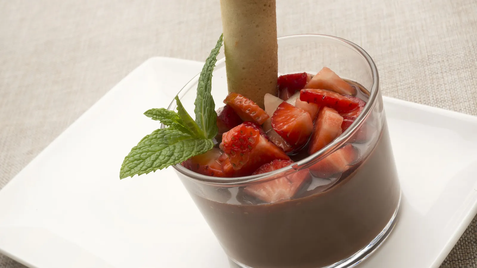 Retira los vasitos del frigorífico y reparte los daditos de fresa por encima. Coloca en cada uno un cigarrillo de barquillo y decóralos con unas hojas de menta.
