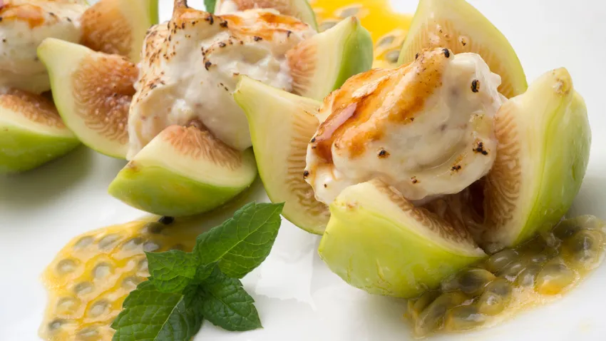 Receta de Eva Arguiñano de higos rellenos de queso caramelizados con azúcar y acompañados de salsa de fruta de la pasión. Un postre perfecto para el otoño.