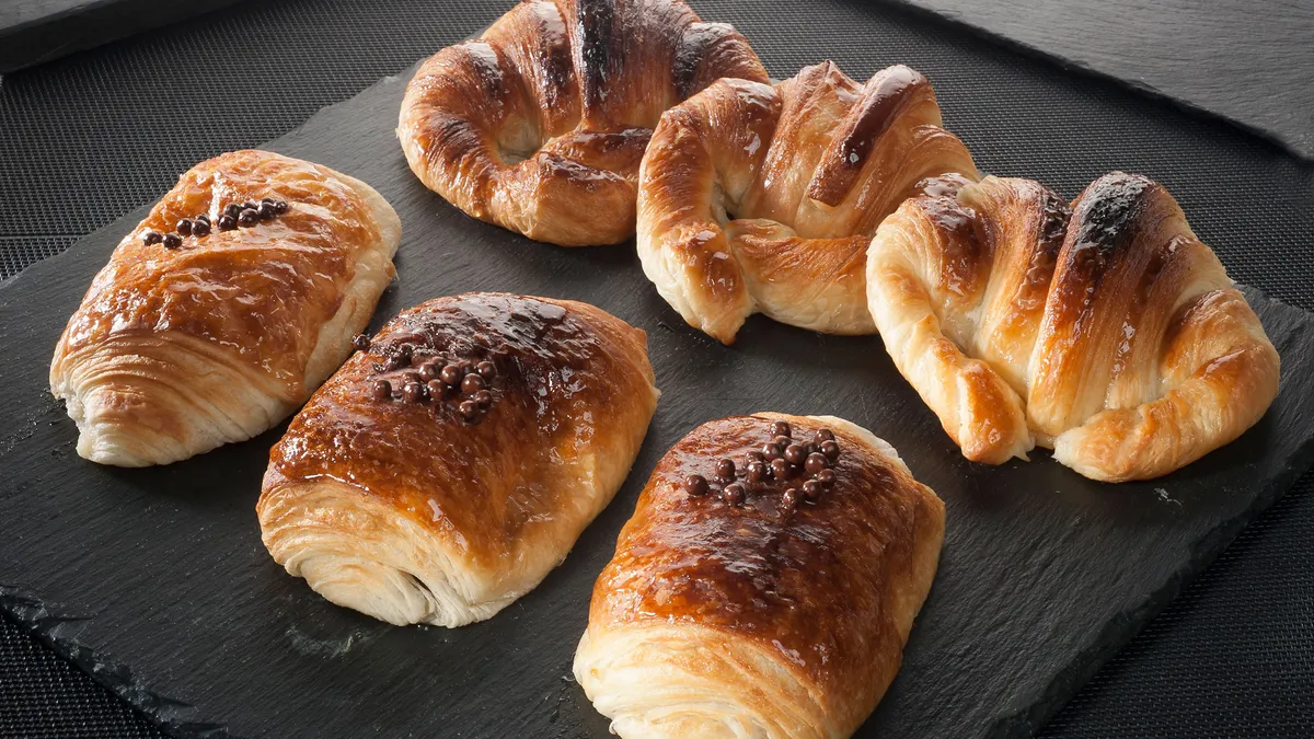 Precalienta el horno a 200º C. Hornea las napolitanas y los croissants durante unos 10-12 minutos, hasta que tengan un color dorado. Sácalos del horno y úntalos con el jarabe. Espolvorea unas pepitas de chocolate sobre las napolitanas. Sirve.