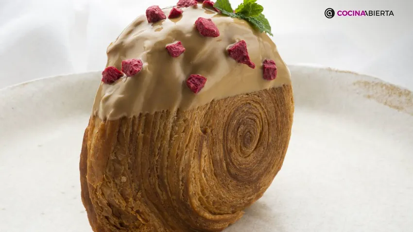 Sí que es verdad que la masa es un poco más densa que la de un cruasán clásico. Una vez horneado se le hacen unas aberturas para rellenarlo de distintos ingredientes entre los que figuran por ejemplo el chocolate o pistacho.