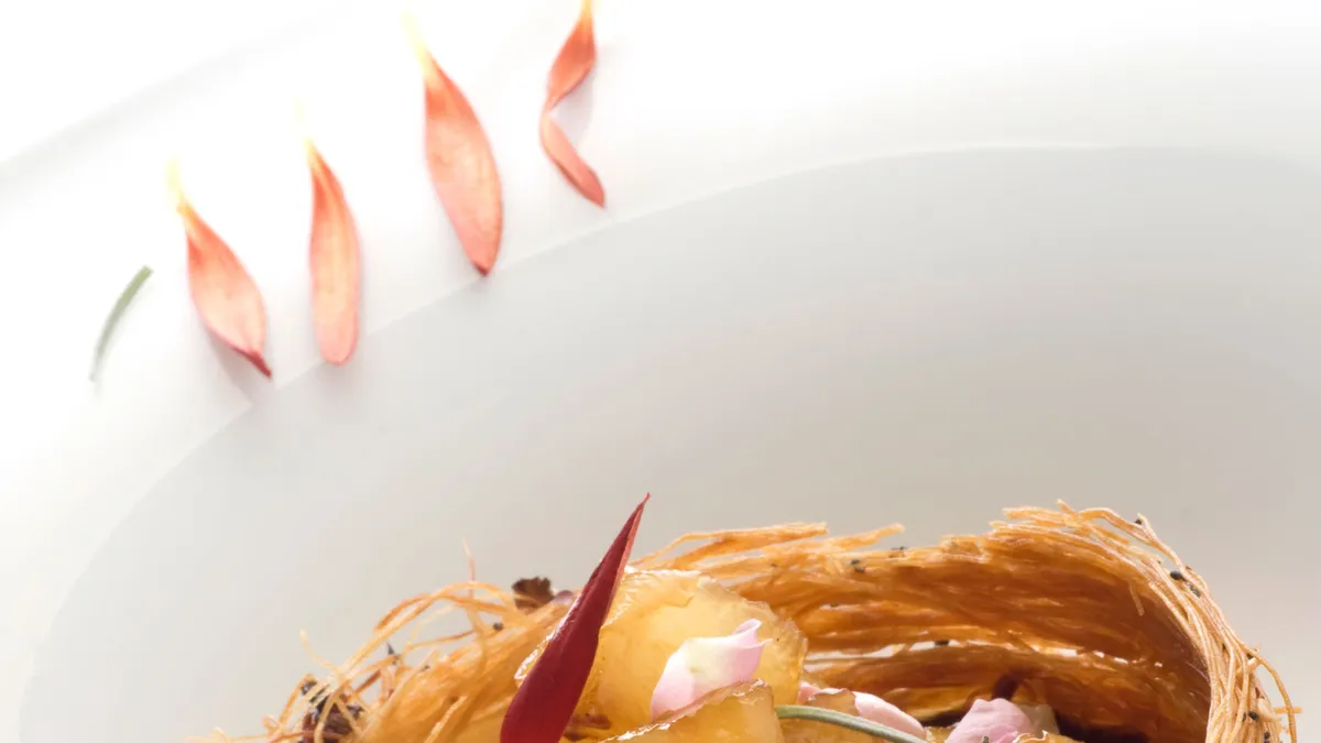 Para hacer el nido de las peras, coloca dos moldes cilíndricos en una bandeja de horno cubierta con papel de horno y envuélvelos con la pasta Kataifi. Vierte sobre la pasta un poco de aceite y esparce por encima las semillas de amapola y sésamo y la pimienta rosada machacada. Introduce en el horno (precalentado) a 180º C, durante 10 minutos. Retira y desmolda.