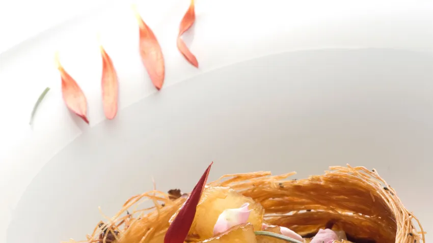 Sirve el chocolate de vainilla en el plato y coloca encima las peras caramelizadas. Acomódalas en su nido y decora con flores (pétalos de pensamiento, caléndula) y hojas de menta.