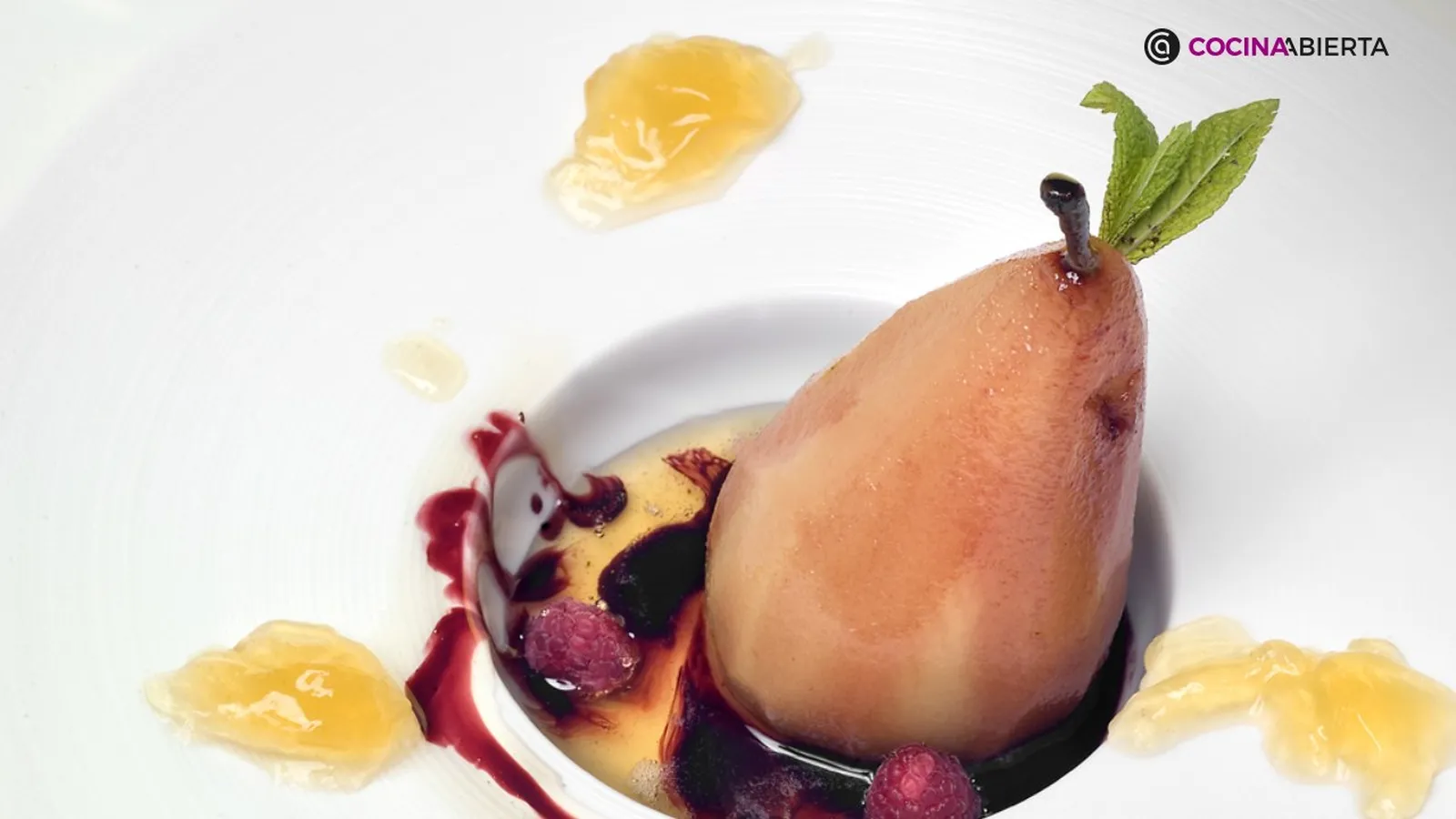 Sirve cada pera en un plato individual, píntalo con un poco del caldo reducido y baña cada una con la salsa de vino. Puedes acompañarlas de unas gelatinas de té caseras. Para elaborarlas, pon agua a hervir y agrega tres sobres de té verde. Deja que infusionen unos minutos, retira los sobres, diluye una cucharadita de agar-agar y mezcla bien. Vierte a un molde forrado con film de cocina y deja que cuaje.