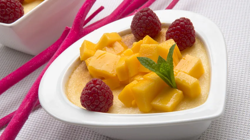 Eva Arguiñano prepara un postre de pudin de coco y leche condensada decorado con mango y frambuesas.