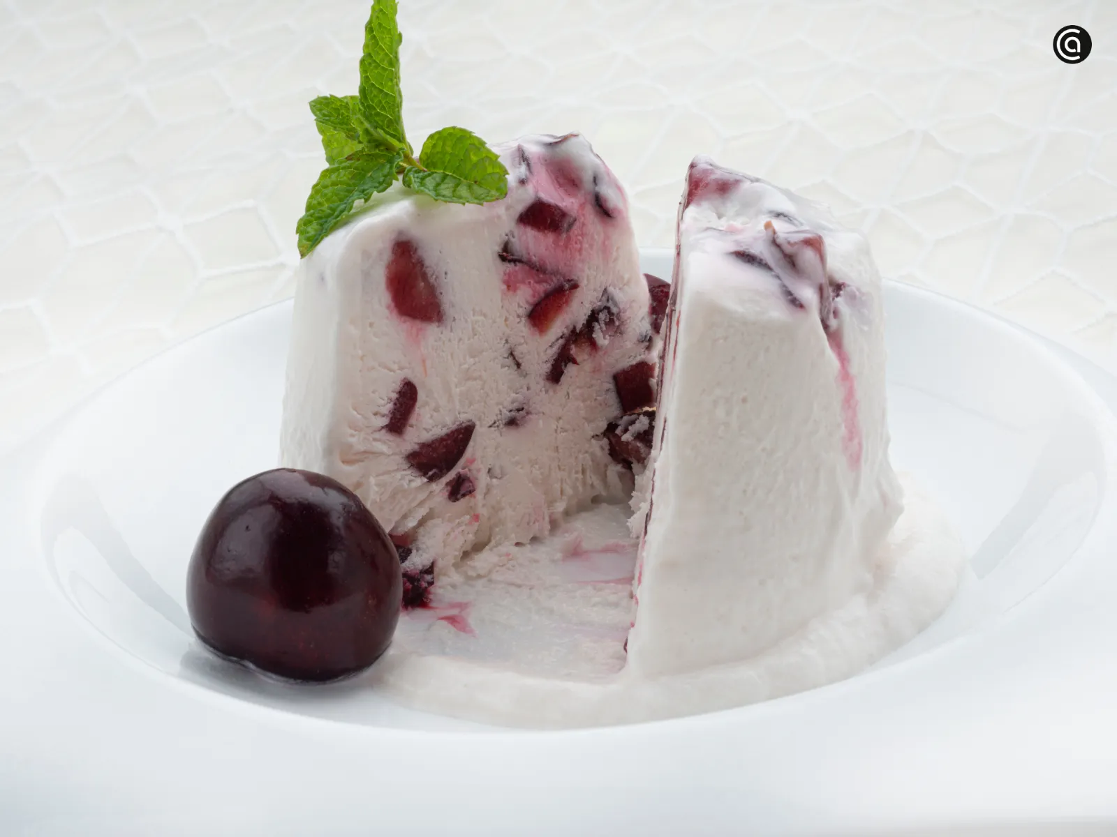 Desmolda y sirve el semifrío de cerezas con una cereza y unas hojas de menta a modo de decoración.