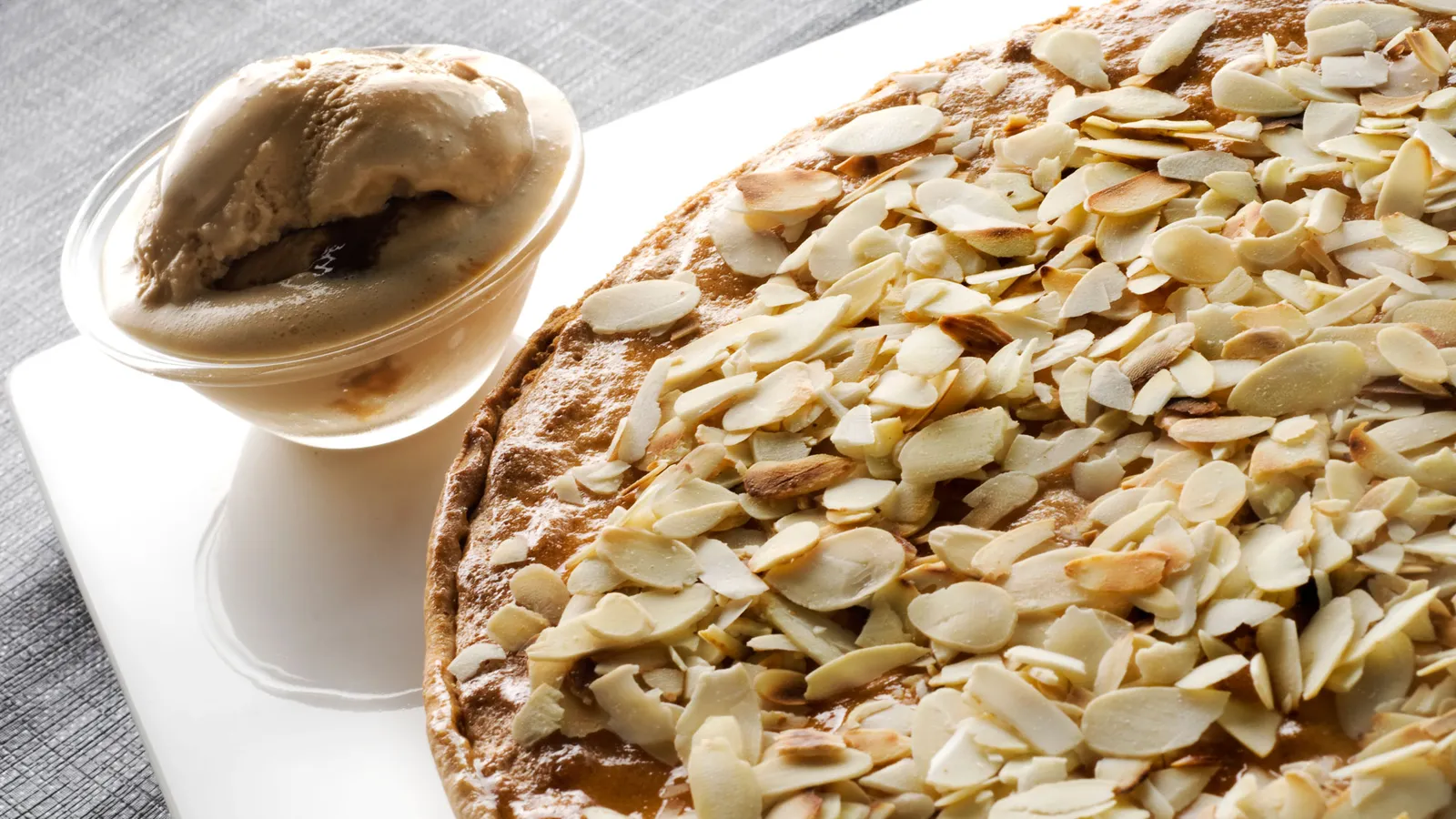 Sirve la tarta de almendras y acompaña con helado de caramelo o vainilla.