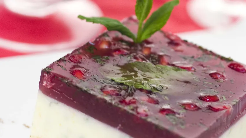Saca los moldes del frigorífico y coloca encima los granos enteros y un poco de menta y para terminar vierte el jugo de gelatina por encima. Decora con una hoja de menta cada molde y vuelve a dejarlos en la nevera para que cuajen.