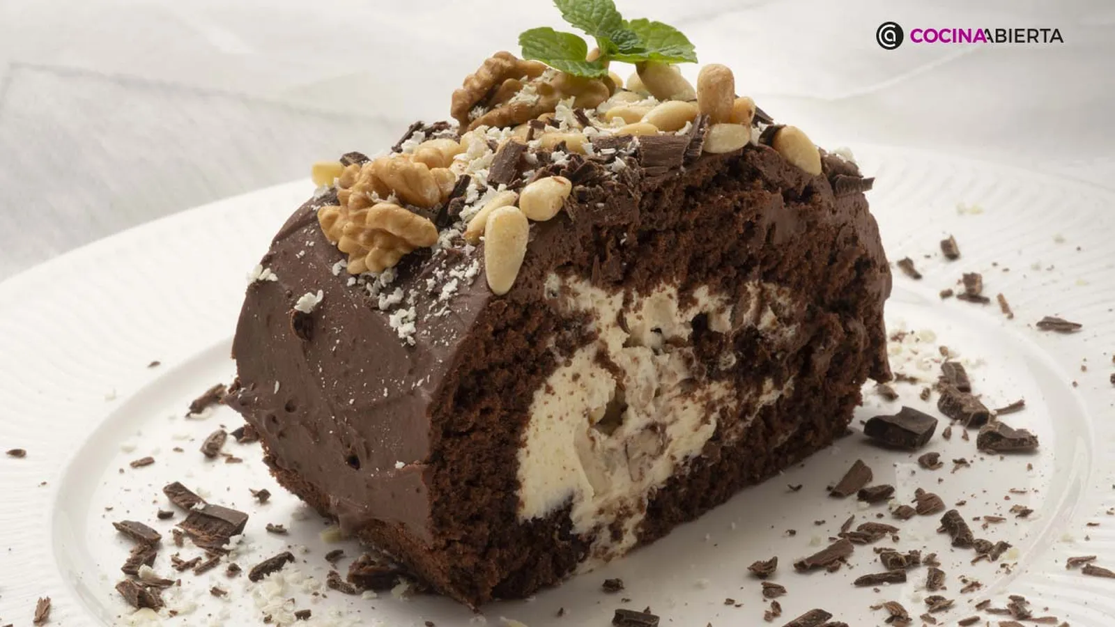 Adorna el tronco de chocolate con piñones, nueces, virutas de chocolate blanco, de chocolate negro y unas hojas de menta.