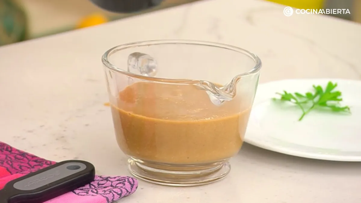 Elimina las ramas de tomillo y reserva los trozos de cordero para otra ocasión. Pasa el resto de los ingredientes de la salsa al vaso americano y tritúralos hasta conseguir una salsa homogénea.