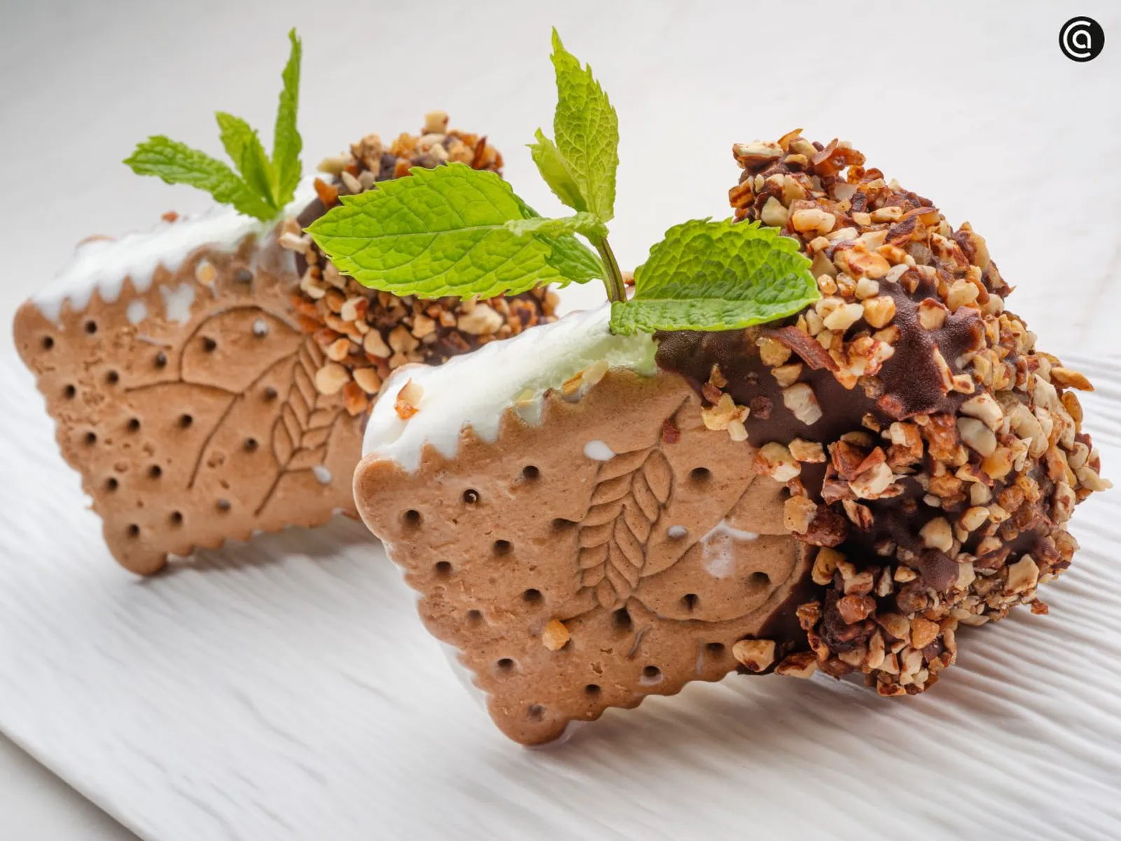 Este dulce bocado lleva una capa de helado de nata entre dos galletas, cubierto de chocolate y crocanti de almendra.