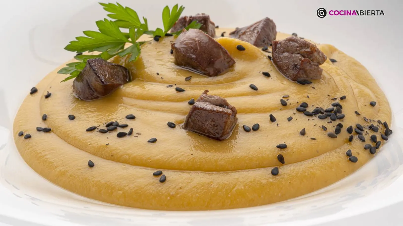 Como guarnición, hemos agregado unos higaditos de pollo, pero si no os gustan o no queréis incluir nada de proteína animal, podéis freír unos costrones de pan o unas láminas de alcachofa.
