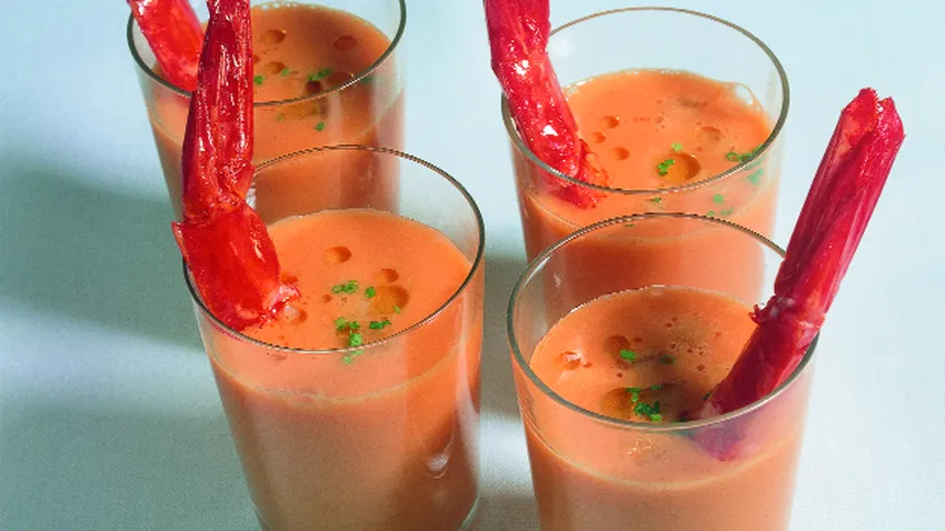 Gazpacho de sandía con gambas maceradas fritas y pan crujiente